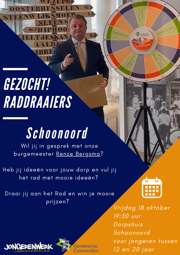 Op vrijdagavond 18 oktober komt de burgermeester van Coevorden naar het dorpshuis in Schoonoord. Jongeren kunnen met de burgermeester in gesprek over hun eigen dorp. Denk hierbij aan dingen die ze missen of juist heel leuk vinden aan Schoonoord of andere onderwerpen. Hun namen worden opgeschreven en in een grabbelton gedaan. De burgermeester trekt namen en vervolgens mogen ze aan een rad draaien en mooie prijzen winnen. Denk hierbij aan bioscoopbonnen, fashion cheque, eigen ideeën om te organiseren in het dorp, pot snoep ect.